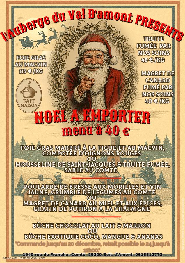 Pour les fêtes de fin d'année, l'Auberge du Val D'Amont vous propose pour Noël son menu à emporter à 40€ par personne. Les commandes seront possible jusqu'au 20 Décembre avec retrait possible le 24 jusqu'à 12h00.