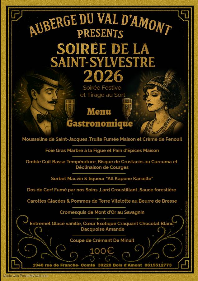 Pour La Saint Sylvestre, notre équipe vous propose son menu gastronomique avec soirée festive et tirage au sort !